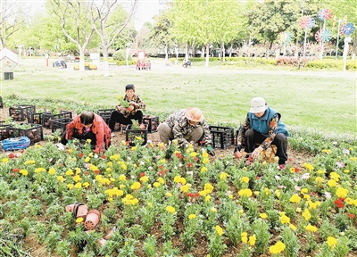4月7日,园林工人在市区中银广场栽种花卉。为迎接第二十三届中国(漯河)食品博览会,连日来,市园林绿化养护中心组织工人在市区广植矮牵牛、万寿菊、孔雀草、彩叶草等,喜迎八方来客。