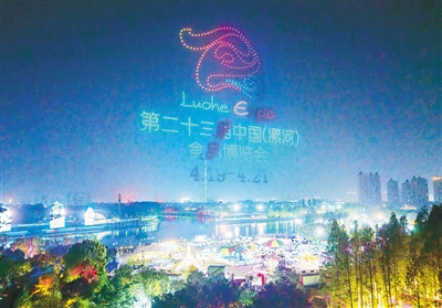①4月11日晚,千机飞“只有漯河”无人机表演在沙澧河风景区红枫广场上空举行。千架无人机组成第二十三届中国(漯河)食品博览会等造型,诠释“乘春风 赴新程”主题。
