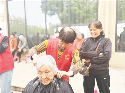 ②4月11日,天桥义工在召陵区天桥街街道漓江路社区党群服务中心开展“爱见周六”志愿服务活动,为群众提供理发、磨剪子等服务。