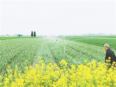 4月12日,临颍县陈庄乡伙邵赵村村民为大蒜浇水。