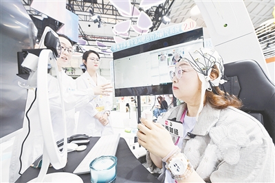 上图:4月14日,展商在消博会现场展示美妆多维全息AI感官行为研究系统。