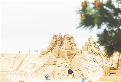 4月14日,沙雕艺术家在创作沙雕作品。