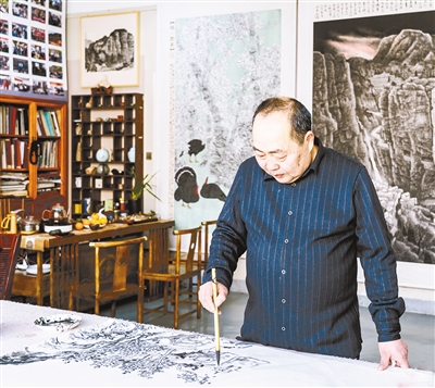 近日,在市山水画院创作室,几名书画爱好者拿着画作围在院长何彦超身边向他请教。何彦超一一点评,提出指导意见。画室的墙壁上悬挂着巨幅山水作品,气势雄浑,意象新颖。